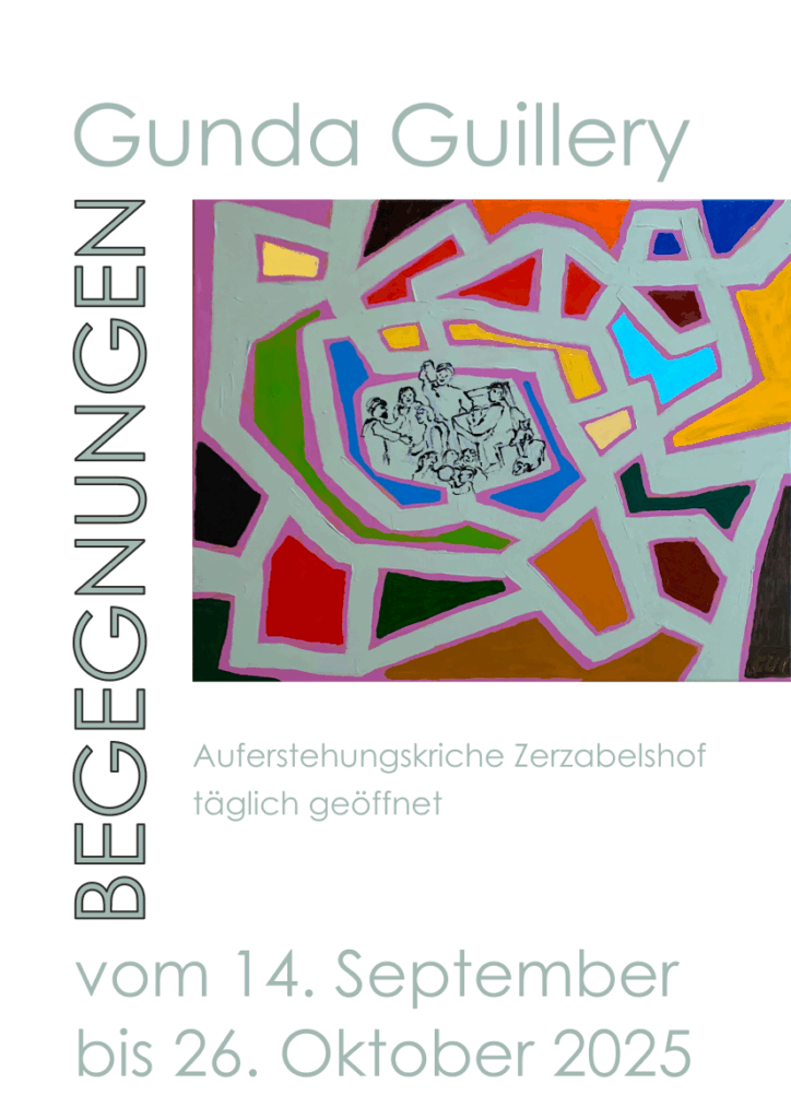 Vom 14. September bis 26. Oktober ist in der Auferstehungskirche wieder Kunst zu Gast. Gunda Guillery zeigt Werke zum Thema „Begegnungen“. Die Kirche ist täglich geöffnet.